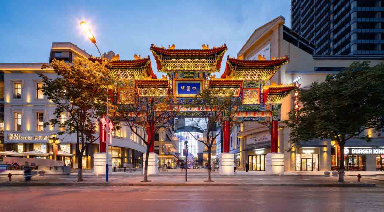 四海唐人街以世界著名的唐人街為藍本,提取唐人街文化中所展現的中華傳統文化與西方文化的兼容并蓄,將西方建筑背景與強烈中國傳統元素的建筑形式混搭,形成一種中西文化結合的特色情景商業街。建筑風格彰顯唐人街文化。